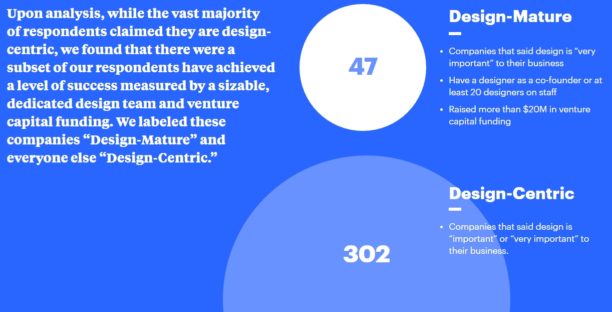 Après cette analyse, il a été prouvé qu’il existe deux types d’entreprises : les design mature, celles qui ont atteint un niveau de maturité vraiment avancé et qui ont un pôle design spécialisé, avec une équipe et un budget dédiés. Et les design centric , c’est-à-dire celles qui sont préoccupées par le design et sont en pleine mutation. La majorité des entreprises interrogées font partie de cette catégorie (302 des 408) et affirment qu’un design soigné fait une différence « importante » voire « très importante » dans leurs affaires.