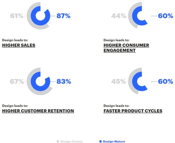 Seulement 47 sont considérées comme design mature en termes d’avancées design car elles disposent d’au moins 20 designers, un chef de pôle et ont levé plus de 20 millions de dollars dans le but de développer cette activité. Sans grande surprise, celles-ci sont bien moins nombreuses que le design centric, mais elles se portent bien niveau business. 87% révèlent que leur investissement leur a permis d’augmenter leurs ventes, de favoriser l’engagement des consommateurs et également d’accélérer le cycle de renouvellement de leurs produits et systèmes.
