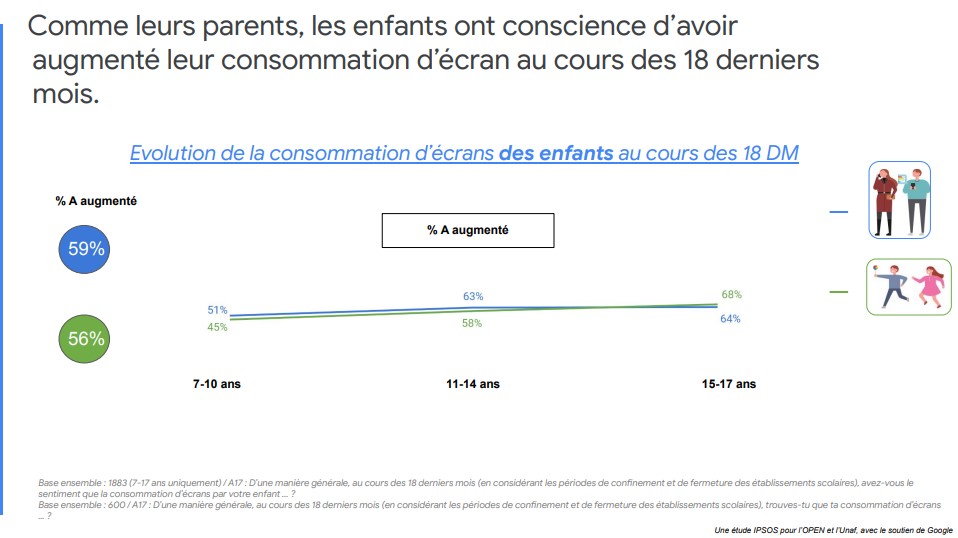 Les perceptions des parents (59 %) et des enfants (56 %) sont très proches pour reconnaître que la consommation d’écrans des enfants a augmenté au cours des 18 derniers mois.