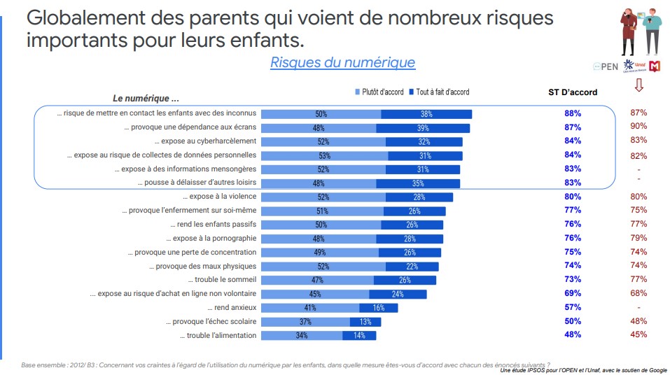 Quant à évoquer les risques d’Internet, là encore les perceptions des parents et des enfants divergent. D’un côté, les parents évoquent des risques sociaux liés aux pratiques numériques de leurs enfants, notamment :