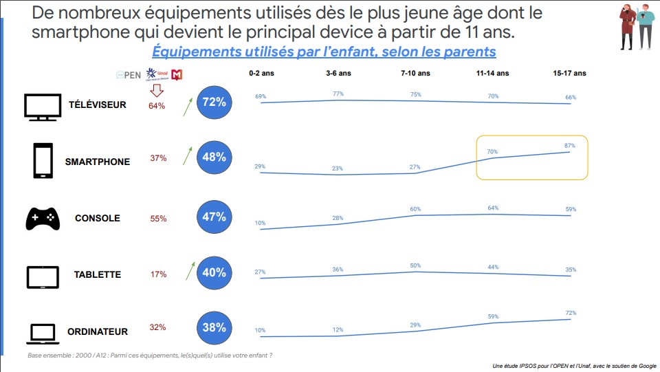 Selon les parents interrogés, le smartphone est l’outil le plus utilisé par leurs enfants, notamment pour les tranches d’âge suivantes : les 11-14 ans (70 %) , les 15-17 ans (87 %). D’après ces estimations, l’utilisation du smartphone connaît une hausse de 11 points, passant de 37 % à 48 % entre 2019 et 2021. Parmi les autres outils utilisés par les enfants :