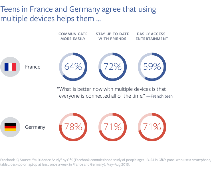 Facebook dispose de très nombreuses données sur ses utilisateurs. Elles sont analysées sur Facebook IQ, l’espace dédié aux études et insights du réseau social. La dernière en date nous en dit plus sur les jeunes et leur usage du multi-écran. L’étude est particulièrement intéressante puisqu’elle porte sur les jeunes Français, et les compare aux Allemands. On y apprend notamment que le smartphone est quasiment devenu une extension du corps chez les plus jeunes, et qu’ils le considèrent comme « leur ombre » ou leur « seconde peau ». Facebook précise même que le smartphone n’est pas simplement quelque chose qu’ils possèdent, mais une part de leur identité. La série sur les « jeunes » est le premier volet d’une étude sur l’usage des différents devices conduite par Ipsos Media CT et Gfk auprès de 2000 personnes en France et en Allemagne. Voici les premiers résultats concernant les 13-17 ans.