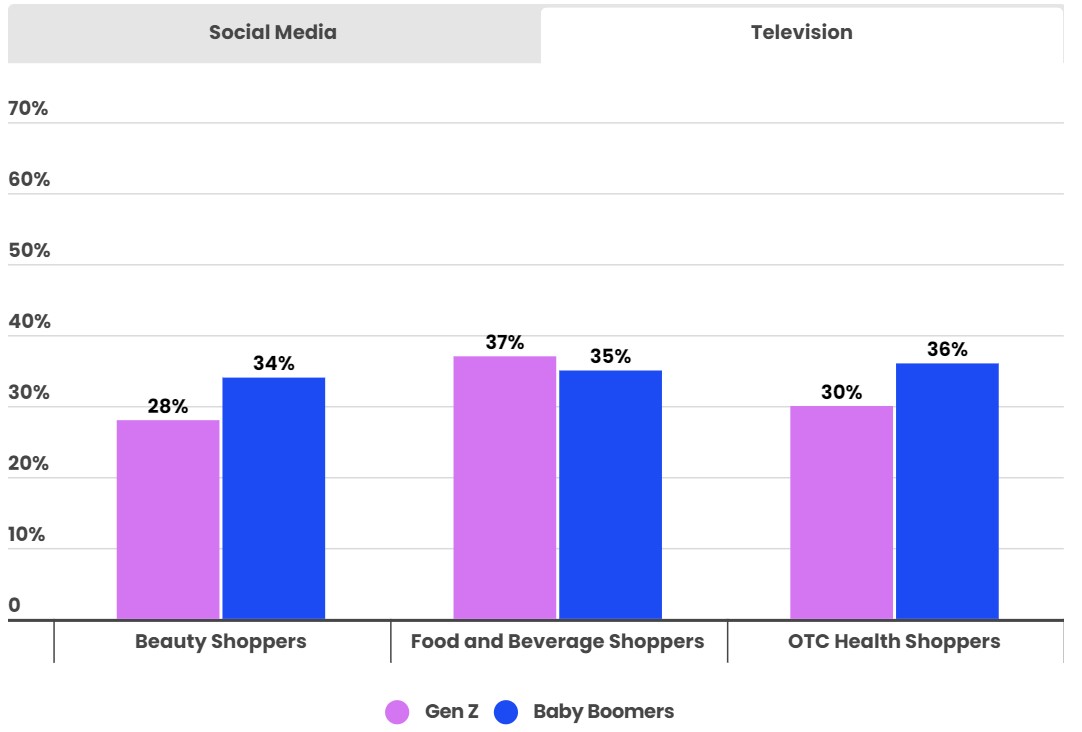Sans surprise, les membres de la génération Z utilisent massivement les réseaux sociaux et cette tendance a une influence sur leurs habitudes de consommation. Ainsi, parmi les consommateurs de produits de beauté, 65 % des zoomers ont effectué un achat après avoir aperçu un produit sur les réseaux sociaux, contre seulement 26 % de baby-boomers (nés entre 1946 et 1964, voir image à la une). Les écarts sont du même ordre pour les consommateurs de produits alimentaires ou d’articles de santé en vente libre. À l’inverse, pour ces mêmes produits, la télévision semble avoir un impact équivalent sur les zoomers et les baby-boomers.