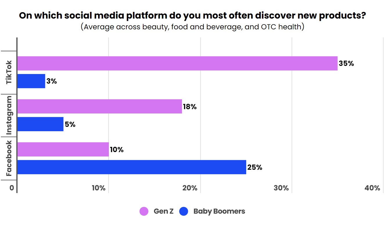 Au niveau des réseaux sociaux, c’est TikTok, suivi d’Instagram, qui représente l’espace au sein duquel la génération Z découvre le plus de produits. Pour les baby-boomers, la découverte se fait plutôt via Facebook. Par ailleurs, l’étude révèle l’importance des influenceurs dans le passage à l’achat. En effet, 87 % des consommateurs de produits de beauté issus de la Gen Z ont acheté un article à la suite d’une recommandation d’un influenceur. Le chiffre atteint 78 % pour les consommateurs de produits de santé et 86 % pour les consommateurs de produits alimentaires.