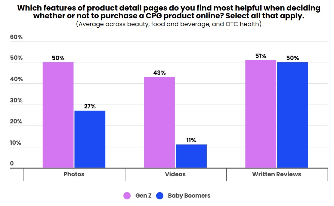 Sur les pages produits, les zoomers accordent, tout comme les baby-boomers, une grande importance aux avis des consommateurs. Mais, contrairement à leurs grands-parents, la dimension visuelle est toute aussi cruciale : 50 % des jeunes panélistes affirment en effet que les photos sont utiles pour se décider à passer à l’achat, contre 27 % des baby boomers.