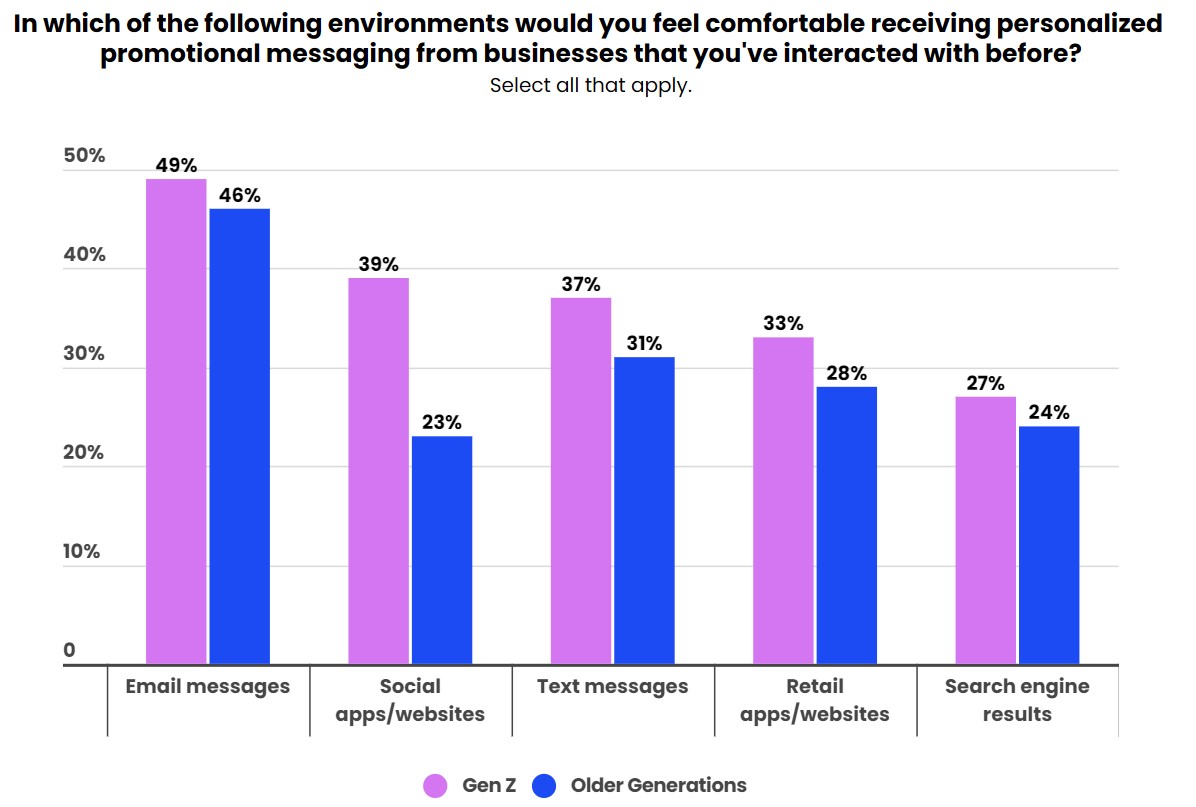 La réception des publicités personnalisées est également mieux acceptée par les zoomers sur l’ensemble des canaux numériques. Cette donnée est particulièrement marquée pour les réseaux sociaux : 39 % des répondants de la Gen Z affirment se sentir à l’aise à l’idée de recevoir des messages promotionnels personnalisés sur les réseaux sociaux, contre seulement 23 % des plus anciennes générations.