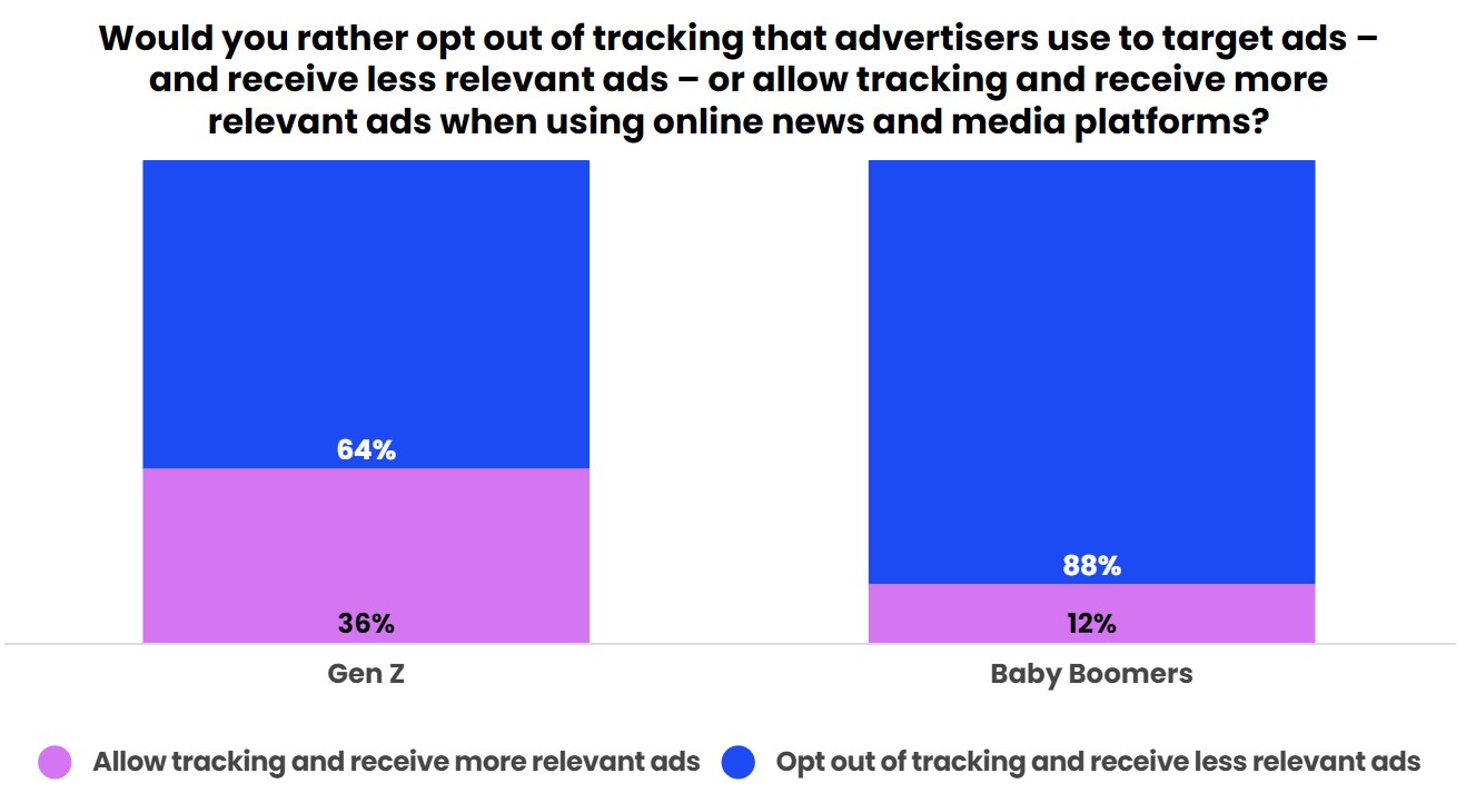 Selon l’étude, les zoomers seraient moins réticents que leurs aînés à l’idée de permettre aux plateformes d’accéder à leurs données pour proposer des publicités ciblées. En effet 36 % acceptent le suivi publicitaire, contre seulement 12 % des baby-boomers. Ils sont également moins nombreux à effacer les cookies de leurs navigateurs.