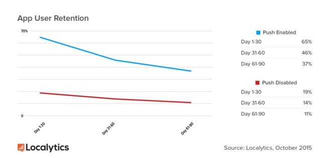 Le grand problème des apps est de ne pas être capable de garder ses utilisateurs actifs après l’installation. On constate en effet que très vite l’usage chute. Quand on se penche sur les chiffres, on constate que l’usage baisse tout de même, mais beaucoup moins que pour les app sans notifications push. A 61-90 jours post téléchargement, la rétention est de 37% avec notifications et de seulement 11% sans notification.
