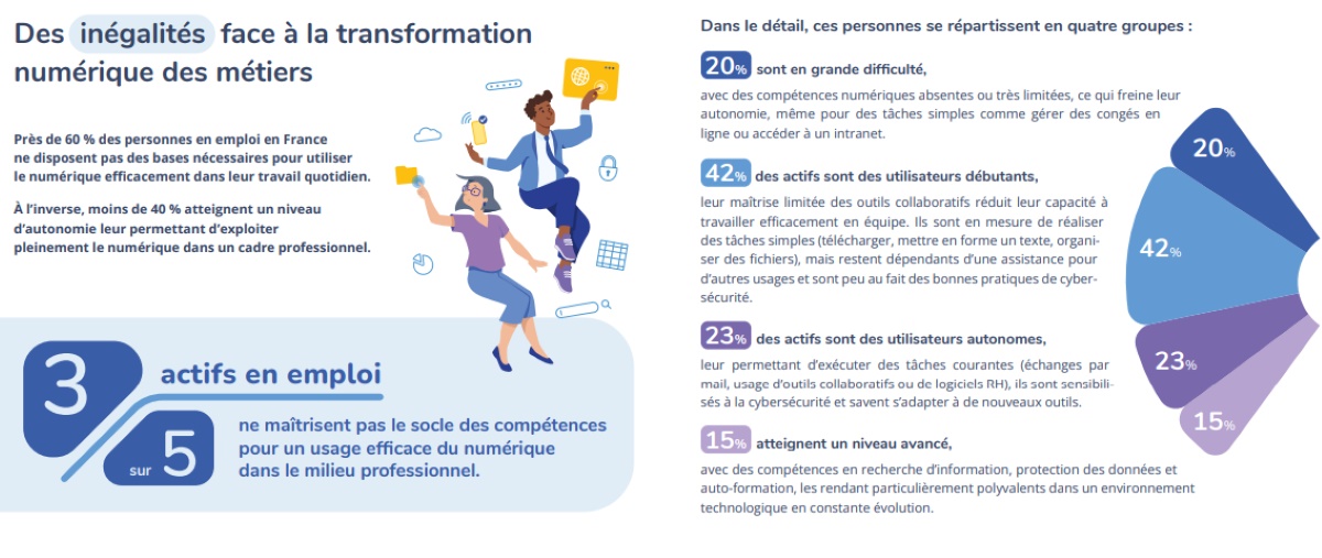À l’inverse, les seniors sont confrontés à des difficultés plus marquées. Pour une grande majorité des salariés de 55 ans et plus, « le numérique au travail reste un défi quotidien« . Seul 1 senior sur 5 est considéré comme autonome et 39 % d’entre eux sont en grande difficulté.
