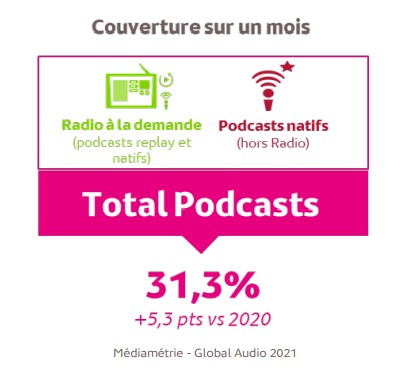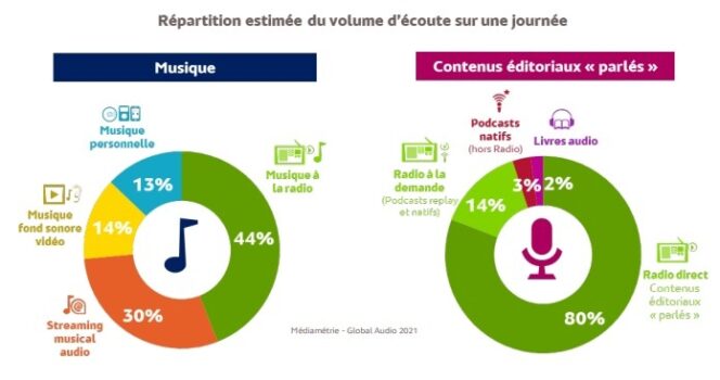 Sur une journée, le volume d’écoute est de 3 % pour les podcasts natifs (hors radio) et de 14 % pour la radio à la demande (podcasts replay et natifs).
