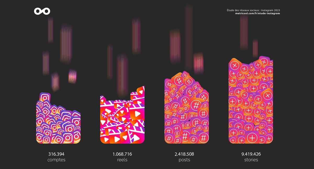 Pour cela, Metricool a analysé 316 394 comptes professionnels, 2,5 millions de posts, 9,4 millions de Stories et plus d’un millions de Reels. Ces données ont été collectées sur 30 jours au cours du mois de juin 2023, puis ont été comparées avec les informations de juin 2022. Cinq catégories de comptes ont été étudiées : de 0 à 500 abonnés, de 500 à 2000, de 2000 à 10 000, de 10 000 à 50 000, et de 50 000 à 45 millions d’abonnés.