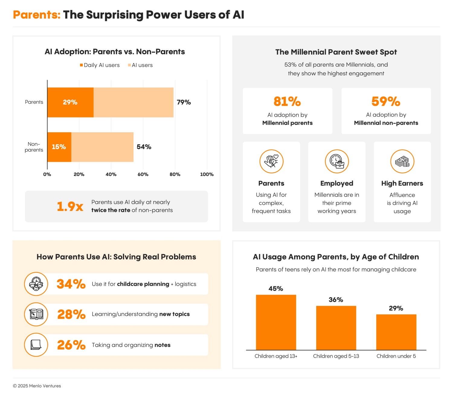 Par ailleurs, une catégorie de la population se révèle particulièrement adepte de l’IA : les parents. En effet, 79 % d’entre eux utilisent l’IA au moins une fois par mois (29 % quotidiennement), contre seulement 54 % chez les non-parents (15 % quotidiennement).