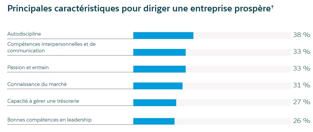 C’est la recette que tout le monde cherche : comment réussir son projet entrepreneurial ? Les dirigeants ont tranché. La caractéristique principale est l’autodiscipline (38 %), devant les compétences interpersonnelles et de communication, puis la passion et l’entrain, à égalité avec 33 % de répondants. On peut noter une différence de réponses entre les hommes (qui mettent l’autodiscipline en avant) et les femmes (qui récompensent les compétences interpersonnelles et de communication).
