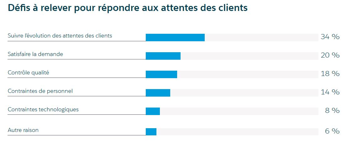 En matière de défis à relever pour répondre aux attentes des clients, c’est le suivi de l’évolution de leurs attentes qui monopolise l’attention (34 %), devant la satisfaction de la demande (20 %) et le contrôle qualité (18 %). Autre défi de taille : 54 % des dirigeants de PME se sentent en situation de désavantage concurrentiel par rapport aux grandes entreprises dans la réponse aux attentes des clients.