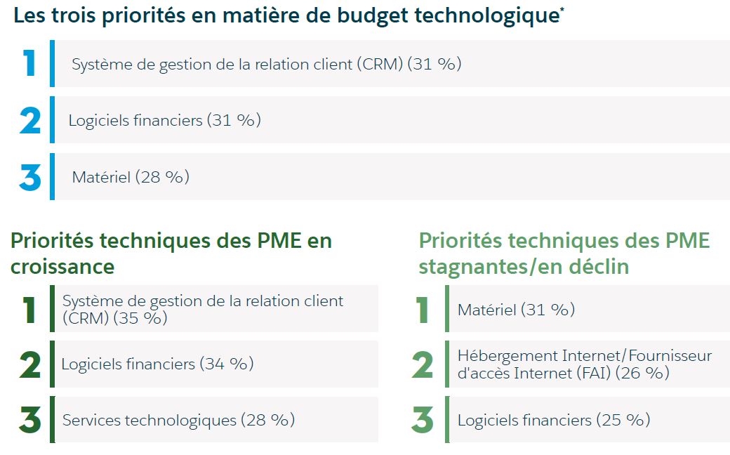 Les systèmes de gestion de la relation client (CRM) arrivent en tête des priorités des dirigeants de PME en matière de budget technologique. Ils devancent les logiciels financiers (31 %) et le matériel (28 %). Mais ce qui est encore plus intéressant, c’est de comparer les priorités techniques des PME en croissance avec celles des PME stagnantes ou en déclin. Là encore, les CRM remportent la palme du côté des PME en croissance, devant les logiciels financiers. Cela n’est pas le cas pour les PME en déclin, qui privilégient le matériel.
