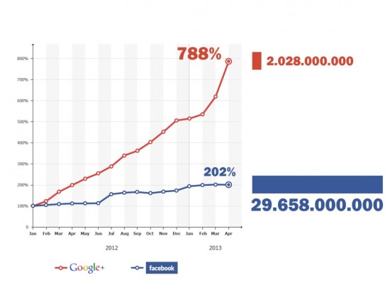 Par ailleurs, la différence de base doit être telle que la plus progression plus importante des partages Google+ en pourcentage ne signifie pas forcément qu’il y a un rattrapage en valeur absolue. Bien au contraire. C’est juste mathématique.