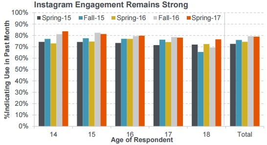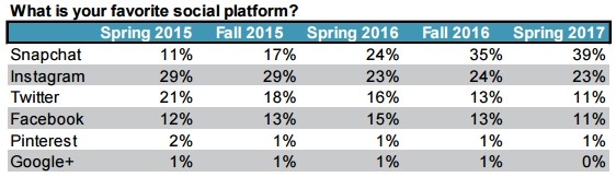 La banque d’investissement Piper Jaffray réalise une étude d’ampleur pour mieux comprendre les usages et les préférences des jeunes générations (14-18 ans) aux USA, tous les six mois. Elle permet de connaître les marques de mode préférées des adolescents, leurs restaurants favoris, mais aussi leurs pratiques numériques. Vis-à-vis des réseaux sociaux, l’étude réalisée au printemps 2017 est formelle : face à la stratégie agressive d’imitation de Facebook, Snapchat fait mieux que résister.