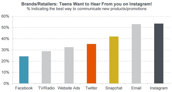 Si l’usage d’Instagram est toujours aussi fort, un autre motif de satisfaction est à souligner : selon les adolescents interrogés, Instagram constitue le meilleur moyen, pour les marques, de s’adresser à eux. Ils préfèrent quand les entreprises publicisent leurs produits sur Instagram, par email, sur Snapchat puis sur Twitter. Les publicités sur les sites web, à la TV/radio et sur Facebook n’ont pas vraiment la cote.
