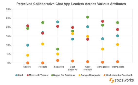 En ce qui concerne Google Hangouts, 16% des entreprises sondées en 2016 déclaraient se servir du service, elles ne sont plus que 11% en 2018. Malgré ses milliards d’utilisateurs, Facebook peine quant à lui à se faire une place sur le marché, Workplace ne réprésentant que 1% des suffrages, un pourcentage similaire à celui relevé dans la précédente étude de Spiceworks.