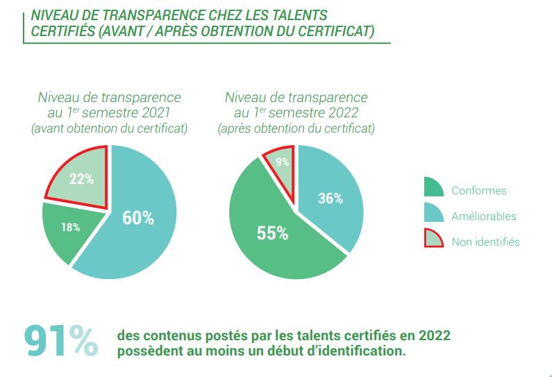 Ainsi, les résultats de l’enquête montrent une grande amélioration du niveau de transparence chez les talents certifiés. L’Observatoire note que 91 % des contenus postés par des influenceurs certifiés possèdent au moins un début d’identification. Le taux de manquement à la mention d’un partenariat passe de 22 % en 2021, avant obtention du certificat, à 9 % en 2022, après obtention du certificat.