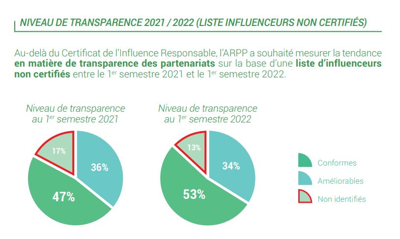 Du côté des influenceurs non certifiés, l’amélioration est moins importante entre le 1er semestre 2021 et le 1er semestre 2022. Ainsi, en 2022, 87 % des contenus sponsorisés ont au moins un début d’identification, contre 83 % au 1er semestre 2021. L’étude souligne cependant que cette tendance prouve qu’une meilleure connaissance des règles de transparence est en train de se généraliser.