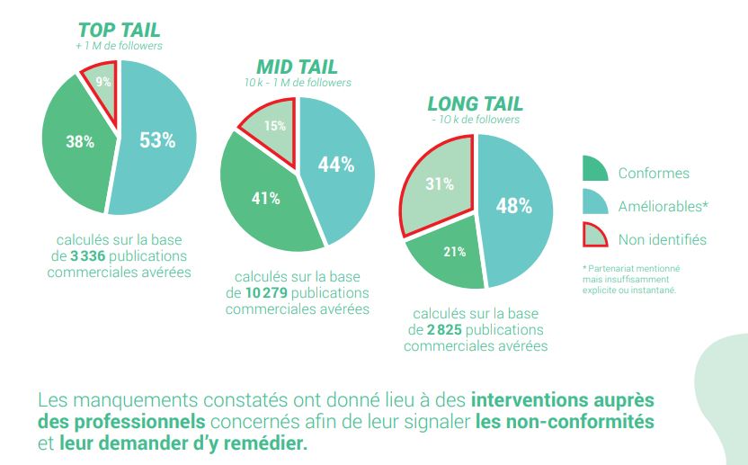 Le constat reste similaire à celui fait l’an dernier, à savoir : le non-respect des règles liées aux partenariats est davantage le fait des influenceurs à faible audience (long trail). Ainsi, ils sont 31 % des influenceurs de moins de 10 000 abonnés à ne pas mentionner leurs partenariats dans le cadre de contenus sponsorisés (contre 43 % en 2020).
