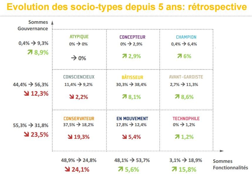 Tous les ans, l’Observatoire de l’Intranet et de la Stratégie Numérique classifie les entreprises selon leurs pratiques. Les résultats sur 5 ans vont dans le bon sens : on compte de moins en moins d’entreprises conservatrices vis-à-vis des RSE et des intranets, et de plus en plus d’entreprises qui déploient une gouvernance équilibrée par rapport aux fonctionnalités proposées.