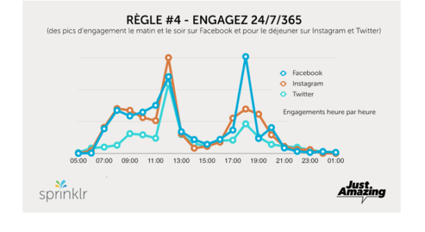 Afin de toujours rester plus proches de leurs clients, les marques doivent s’engager 24h sur 24h, 7 jours sur 7 et tous les jours de l’année, tout en mettant le paquet lors d’événements clés comme Noël ou encore le Black Friday. Les traditionnels pics d’engagement le matin et le soir sur Facebook et au déjeuner sur Instagram et Twitter sont toujours d’actualité, comme on peut le constater sur le graphique ci-dessous.