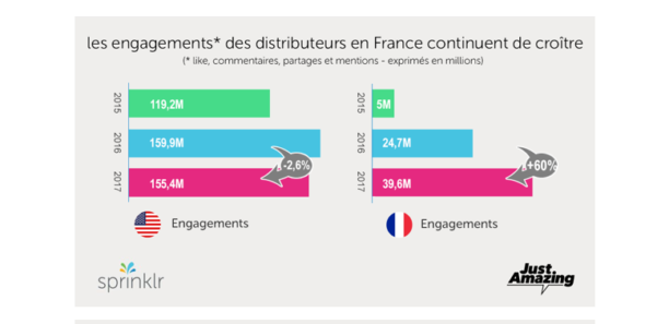 En France, l’engagement des distributeurs (like, commentaires, partages et mentions) continue de croître. Estimées à seulement 5 millions en 2015, les interactions ont augmenté de plus de 60% en 2017, passant ainsi de 24,7 millions en 2016 à 39,6 millions l’an passé.