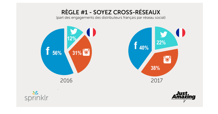 Grâce à l’étude, on constate qu’entre 2016 et 2017 l’engagement des distributeurs français est mieux réparti sur les différents réseaux. L’engagement sur Facebook a ainsi diminué, pour quasiment doubler sur Twitter et continuer d’augmenter sur Instagram. Fabrice Brianson, fondateur de Just Amazing affirme en effet que : « Pour adresser leurs différentes cibles et s’adapter aux usages des consommateurs, les enseignes de la distribution se doivent aujourd’hui d’être présentes sur tous les principaux réseaux sociaux […] Il est donc nécessaire de savoir répartir et doser sa présence sur les réseaux sociaux pour aller là où les consommateurs sont. »