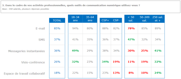 Autre critère déterminant : la taille de l’entreprise ! Les salariés issus d’entités ayant un effectif inférieur à 50 personnes disposent bien souvent de moins d’outils numériques. Ils sont ainsi 47% à se servir des SMS pour échanger dans le cadre de leur activité professionnelle (contre 37% de l’ensemble des salariés). Les autres moyens de communication (comme la visio-conférence et les espaces de travail collaboratifs) y sont nettement moins développés que dans les grandes entreprises, qui elles bénéficient d’un accès à une plus grande diversité d’outils de communication.