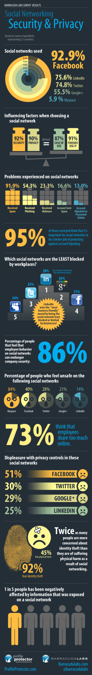 Barracuda Labs, solutions de sécurité informatique, vient de publier les résultats d’une étude menée dans une vingtaine de pays et portant sur la vie privée et la sécurité sur les réseaux sociaux. Les conclusions de cette enquête sont disponibles sous forme d’infographie. Concernant les services les plus utilisés, c’est bien entendu Facebook qui l’emporte, devant LinkedIn, Twitter, Google+ et Myspace, loin derrière les quatre autres. Que Facebook soit le plus populaire des réseaux sociaux est un fait étonnant, si l’on se cantonne aux facteurs qui influencent le choix d’un support selon cette étude. La sécurité et le respect de la vie privée se trouvent en effet à égalité avec la facilité d’utilisation et les amis déjà présents. La réputation de Facebook en la matière étant un peu sulfureuse, sa popularité devrait être moindre… D’ailleurs, 40% des gens déclarent se sentir peu en sécurité sur Facebook, contre 28% sur Twitter, 21% sur Google+ et 14% sur LinkedIn. (et 84% sur Myspace, chiffre pour le moins surprenant…) On retrouve le même palmarès, Myspace excepté, lorsqu’il est question de la difficulté de paramétrer les options de confidentialité sur chacun de ces réseaux sociaux.