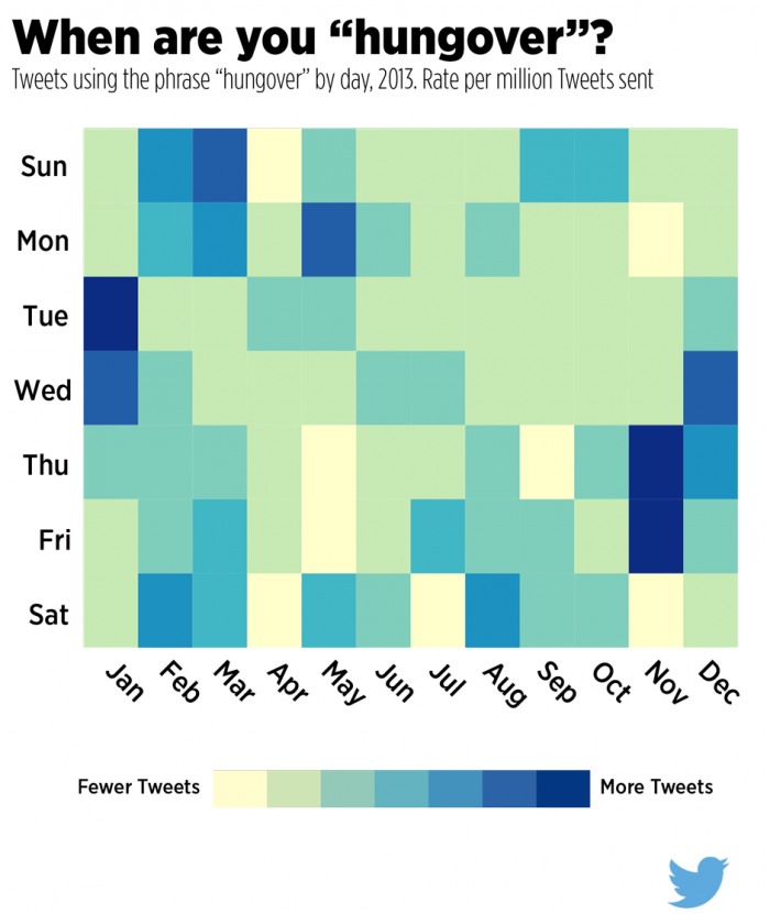 L’étude sémantique Twitter permet de le confirmer : la soirée du Nouvel An est sans doute la plus arrosée de l’année, puisque les utilisateurs ont avoué leurs maux de crâne les mardis de janvier (on imagine qu’ils s’agit principalement du mardi 1er janvier). Malgré cette journée difficile, les internautes ont continué leurs soirées les deux mois suivants, en témoignent les gueules de bois repérées les samedis, les dimanches, et même les lundis de février et de mars. Dernière tendance : les beuveries de novembre, clairement visibles sur ce graphique, après quelques mois de sobriété. Les internautes ont sans doute parlé de leur gueule de bois anticipée le jeudi, avant de confirmer leur pronostic le vendredi.