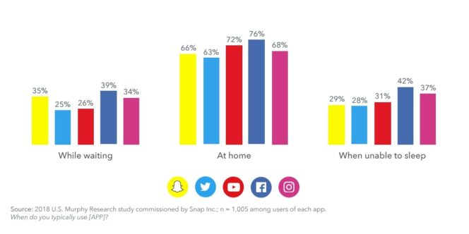 Ainsi, les utilisateurs de Snapchat se connectent le plus souvent lorsqu’ils se déplacent (32%), dans leur trajet quotidien (29%) et en voyage (24%) tandis que Facebook, Instagram et YouTube sont plus souvent utilisés pour passer le temps, à la maison ou en cas d’insomnie.