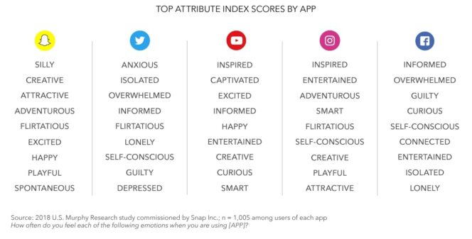 La formulation peut faire sourire, de même que la façon dont les réponses au sondage ont été collectées. Ainsi les sondés devaient sélectionner un qualitatif parmi une liste pour décrire quelle émotion ils ressentent en utilisant Snapchat. Les adjectifs étaient plutôt positifs : « créatif », « attirant », « aventureux », « heureux », « spontané » ou encore « loufoque ». Pour les autres réseaux sociaux, la sélection de mots étaient plus variées : « Déprimé », « informé », « bouleversé », « coupable » ou encore « curieux », « inspiré », « intelligent ».