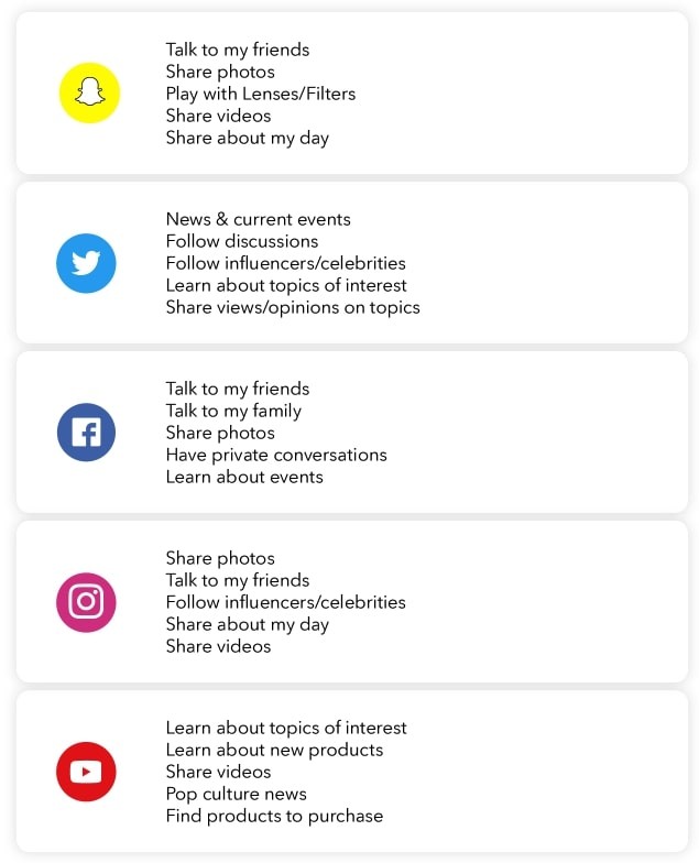 On le savait déjà, Snapchap est une application largement appréciée par les jeunes, ce qui explique pourquoi le réseau social est utilisé pour : « Discuter avec ses amis, partager des photos, jouer avec les filtres, partager des vidéos, partager sa journée », contrairement à Twitter et Instagram qui sont utilisés pour « suivre des influenceurs » entre autres.