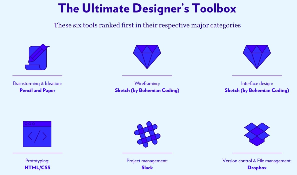 Tous les résultats obtenus ont été compilés au sein d’un joli site dédié : Design Tools Survey. Vous pouvez cliquer sur chaque sous-titre de l’article pour accéder aux outils préférés de chaque catégorie.