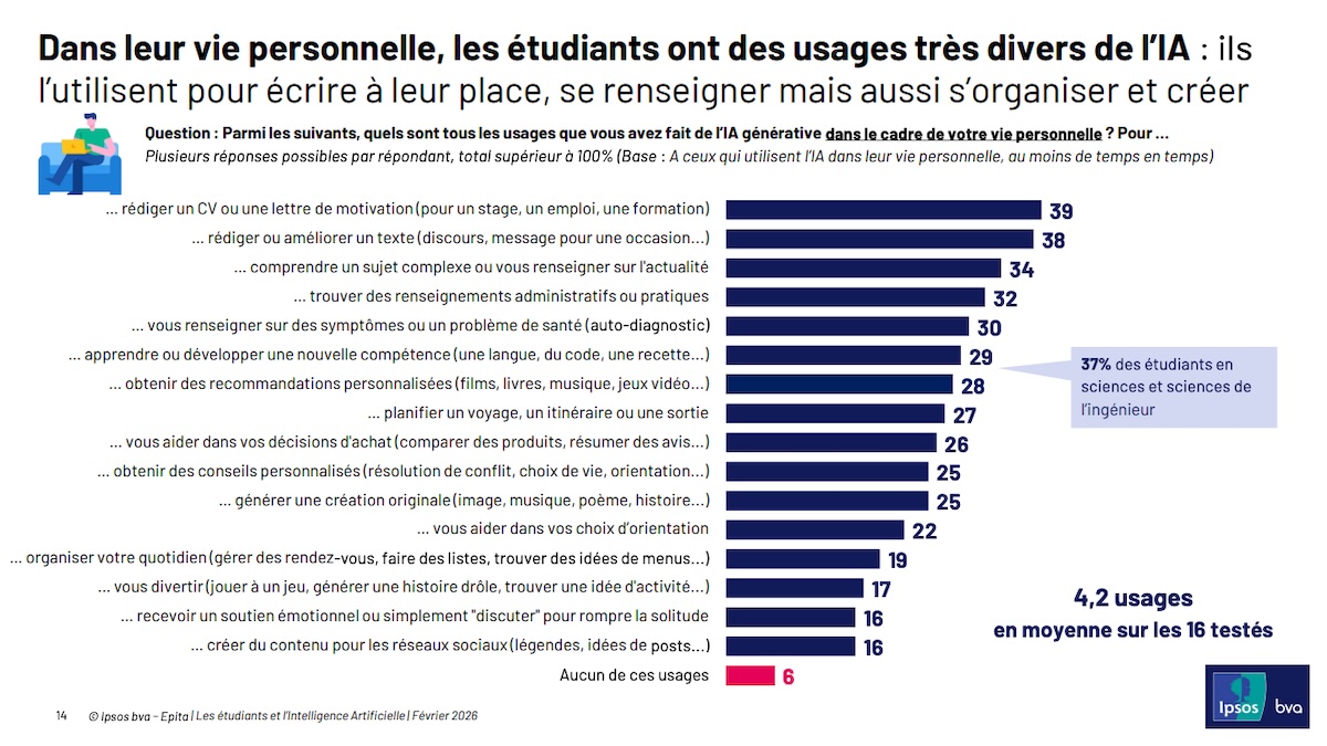 L’IA générative s’est installée dans le quotidien des étudiants français. C’est ce que révèle l’Observatoire des usages de l’IA par les étudiants, une étude réalisée par Ipsos pour l’EPITA auprès d’un échantillon représentatif de 1 000 étudiants de l’enseignement supérieur, interrogés du 2 au 18 janvier 2026.