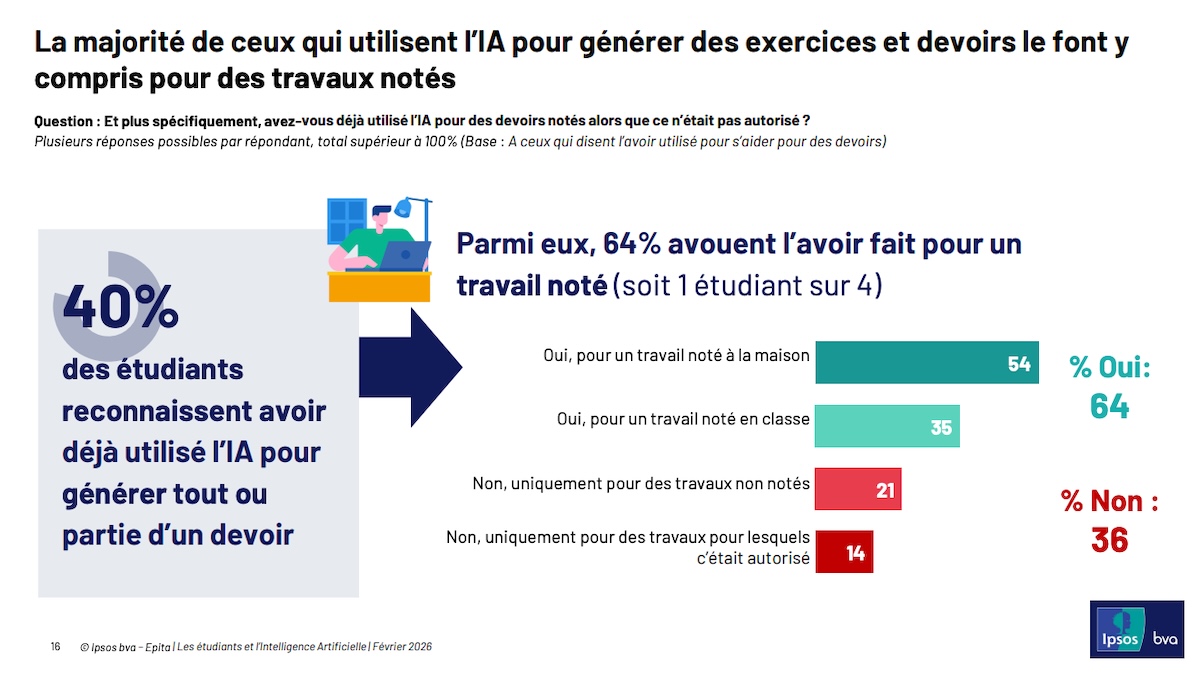 L’étude met en lumière des usages potentiellement problématiques. 40 % des étudiants reconnaissent avoir utilisé l’IA pour « générer tout ou partie d’un devoir ». Parmi eux, 64 % l’ont fait pour un travail noté alors que ce n’était pas autorisé : 54 % pour un devoir à la maison, 35 % pour un travail en classe. Plus globalement, 47 % des sondés admettent s’être aidés de l’IA pour des exercices même quand cela leur était explicitement interdit.