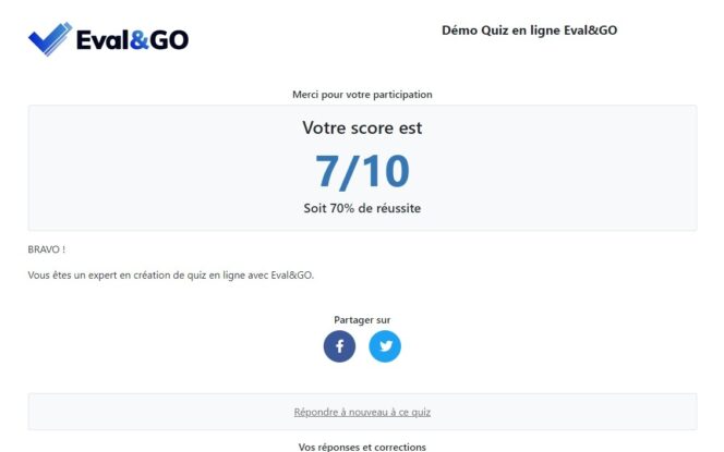 Vous pouvez ajouter un minuteur par question ou pour tout le questionnaire, des corrections, un bouton de partage… Le quiz est évidemment personnalisable avec votre logo.