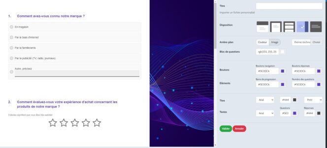 Une fois le contenu du questionnaire ou du quiz terminé, vous avez le choix du design. Evalandgo propose de très nombreux modèles qui sont personnalisables : disposition, arrière-plan, couleurs et polices des éléments et des boutons… Vous pouvez évidemment créer un thème personnalisé qui correspond parfaitement à votre marque.