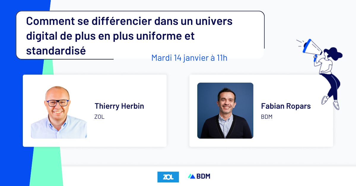 Alors que l’écosystème du digital devient de plus en plus un environnement uniformisé, l’agence ZOL vous invite à participer à son prochain webinar, co-organisé avec BDM, pour vous dévoiler de précieux conseils afin de réussir à vous démarquer. Vous bénéficierez de l’expertise et du décryptage des intervenants, qui reviendront « sans langue de bois » sur l’écosystème digital actuel, et vous dévoileront les principaux pièges à éviter.