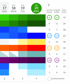 Des statistiques sont à votre disposition pour mesurer votre progression, en fonction des séries de tâches que vous atteignez sur une semaine, un mois et à l’année. Les séries les plus longues sont entourées par un rond de la couleur de votre groupe de tâches.