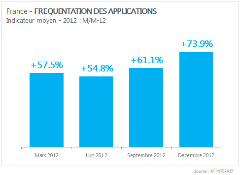 Au contraire, les applications mobiles pour smartphones et tablettes ont le vent en poupe : l’usage de ces dernières a bondi de 73,9% entre décembre 2011 et décembre 2012.