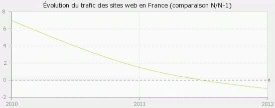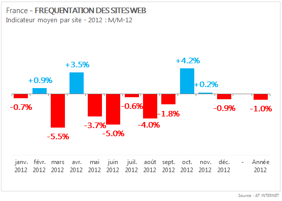 Sur l’année, le trafic des sites web en France est donc en baisse de 1%. C’est la première fois que ce phénomène se produit, mais la tendance n’est pas toute à fait nouvelle. En 2011, la hausse du trafic ne s’est établie qu’à 1,5% sur l’année, du fait d’un recul des visites au second semestre. En 2010, la croissance du trafic web en France avoisinait les 7%.