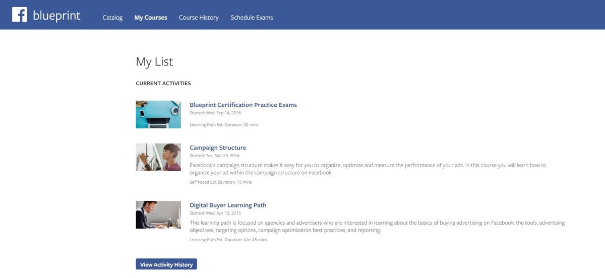 Le programme BluePrint permet de se former aux produits publicitaires Facebook. Il propose une suite complète de cours particulièrement adaptés à l’environnement publicitaire Facebook. Idéal pour se perfectionner avec les différents formats et objectifs Facebook et Instagram. Les cours sont pointus et collent bien à la réalité de l’achat média Facebook. La suite logique était une vraie certification, c’est désormais le cas. Il existe pour l’instant 2 grands types de certifications : « Certified Planning » et « Certified Buying » qui s’adressent donc tout particulièrement aux acheteurs ou ads managers en agence ou chez l’annonceur (ou freelance). La certification « Buying » ne sera accessible que dans quelques semaines. Une troisième certification plus générique est aussi disponible « Advertising Core Competencies ».