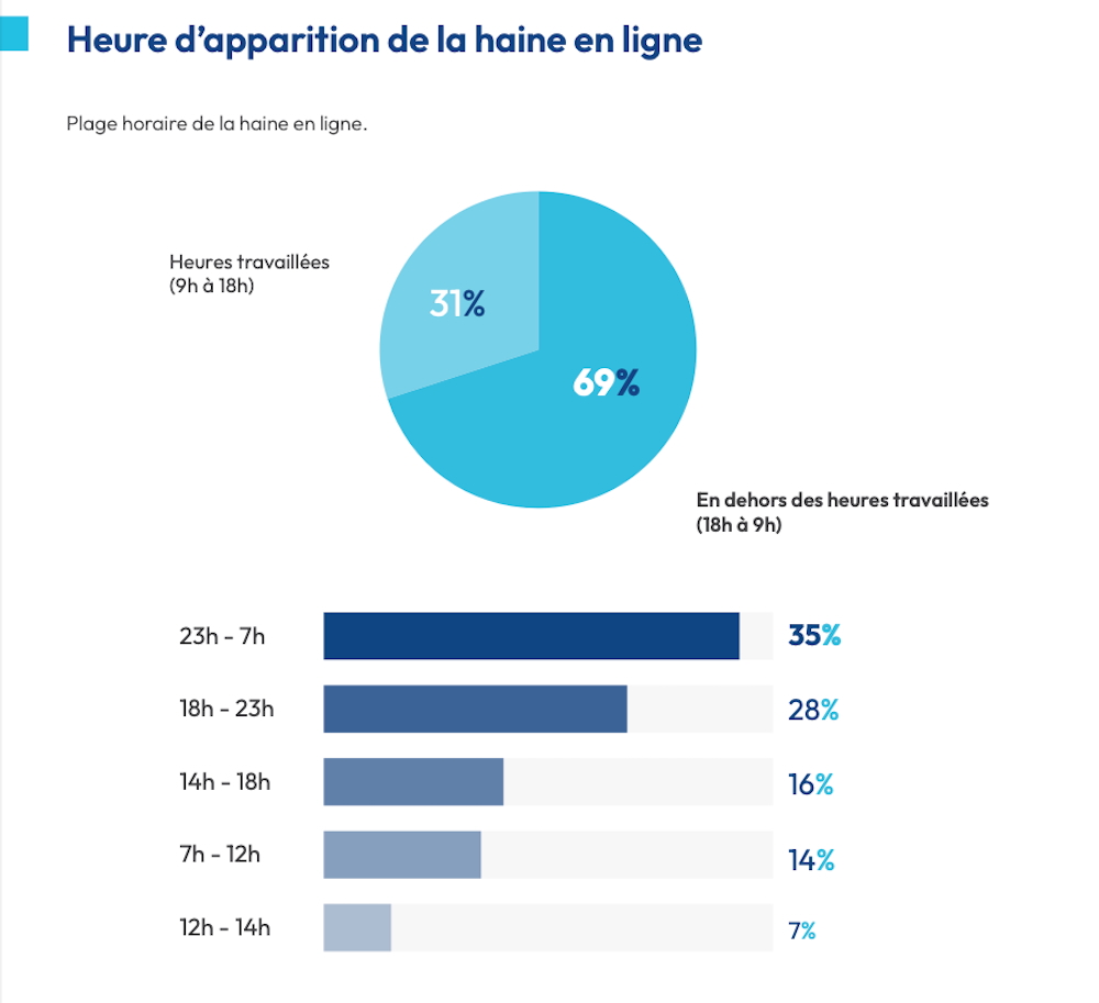 Comme l’an dernier, 69 % des messages toxiques sont publiés en dehors des heures de bureau (entre 18h et 9h), dont 35 % entre 23h et 7h. Cette temporalité nocturne complique la modération en temps réel.