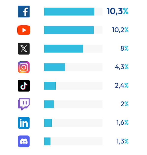 - LinkedIn atteint 1,6 % (contre 0,6 %), soit un bond d’un point en un an, confirmant la tendance observée en 2024.
