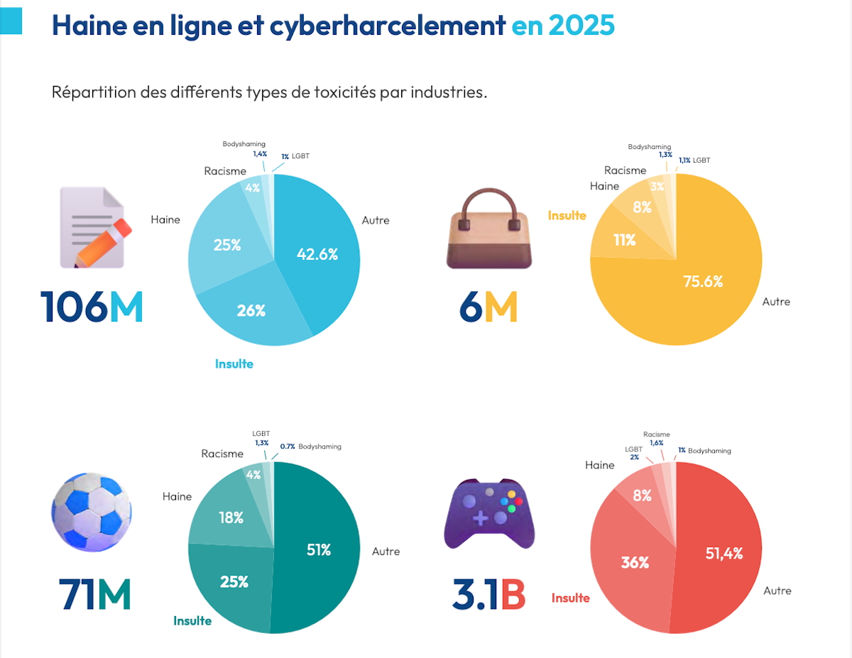 - La haine directe pèse 14 % des contenus toxiques (contre 20 % en 2024), soit 25,6 millions de messages.