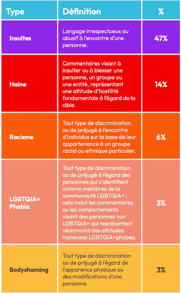 Sur les 14,3 milliards de commentaires analysés par Bodyguard, 182 millions ont été identifiés comme toxiques. L’Observatoire classe la toxicité en ligne en plusieurs catégories, dont les insultes, la haine directe, le racisme, la LGBTQIA+phobie et le bodyshaming :